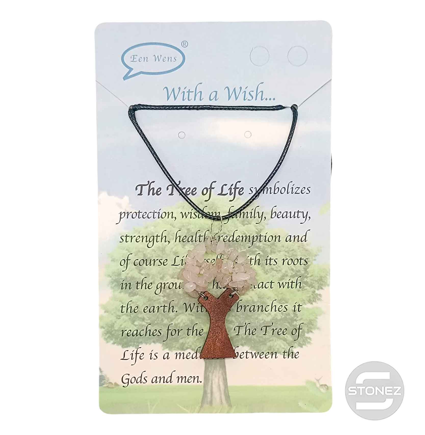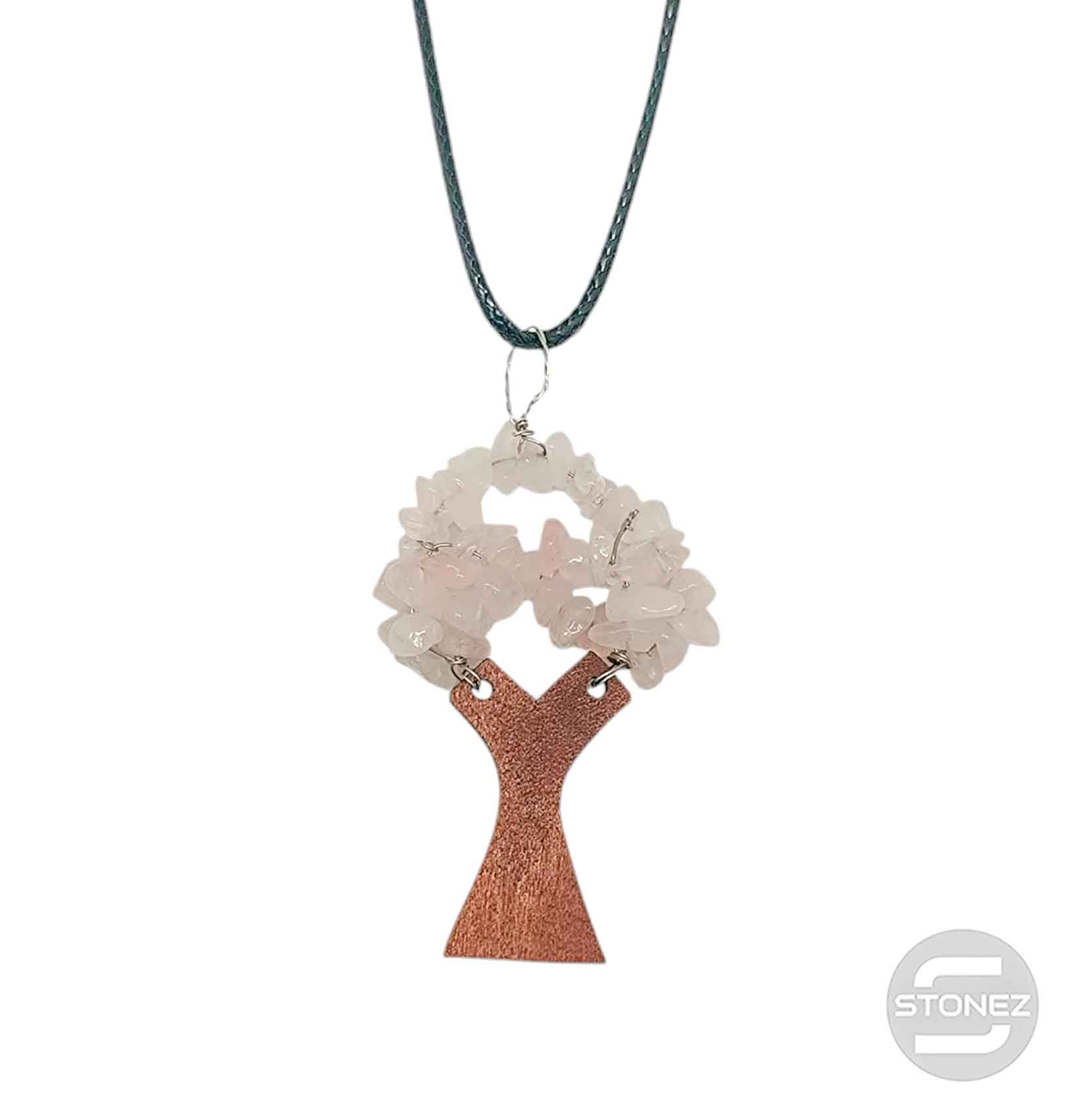 Colgante Árbol De La Vida Madera Y Piedra Cuarzo Rosa 4,5 Cms Aprox Con Cordón 45 Cms