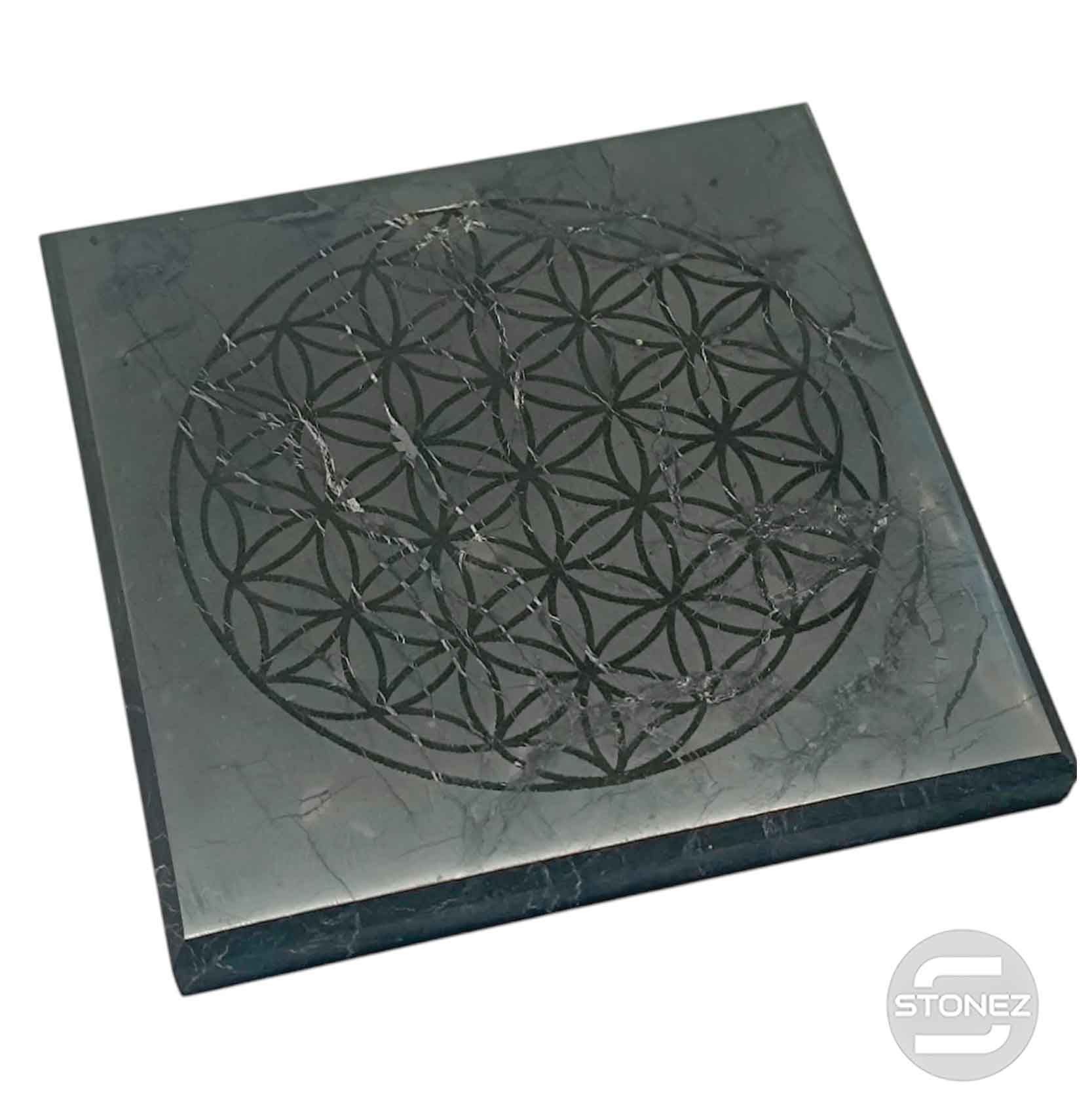 600803857-04 Base Shungita 10x10 Cms Aprox Pulido Grabado Flor de la vida