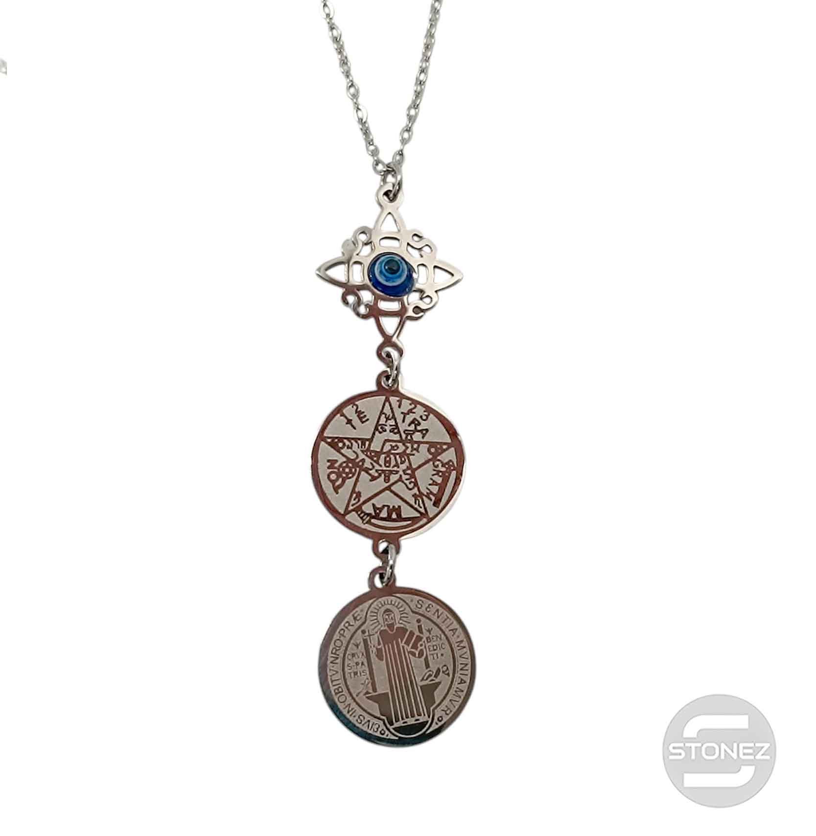 Collar Acero Triple Proteccion Nudo De Bruja Ojo Turco Tetragramaton Y San Benito Cadena 40+5 Cms