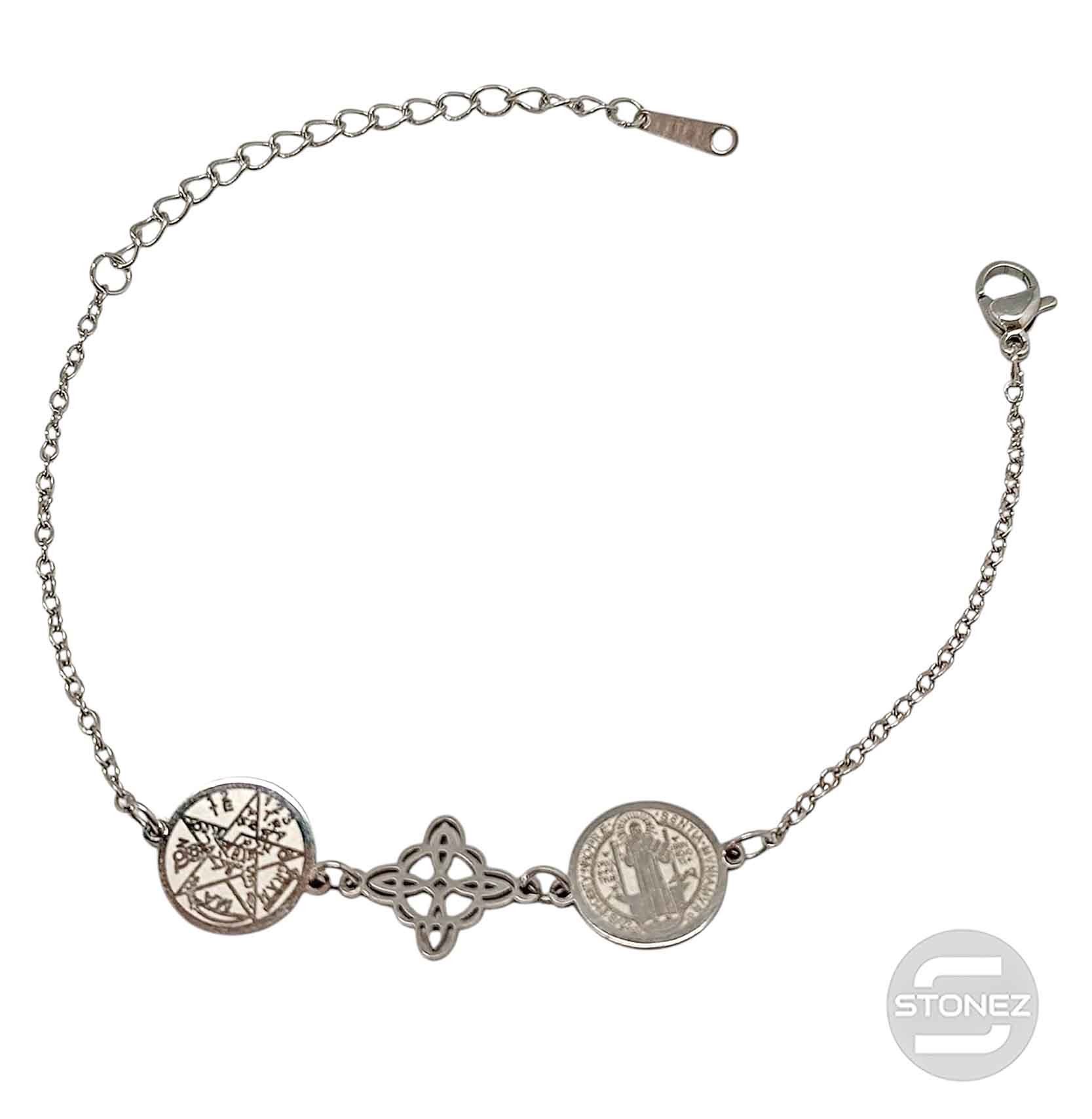 Pulsera Acero Triple Proteccion Con Dije Nudo De Bruja Tetragramaton Y San Benito